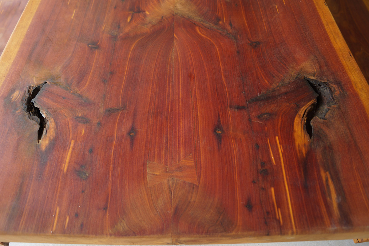 Live edge native red cedar planks are book matched with bow tie inlays. Supported with rustic patina legs.